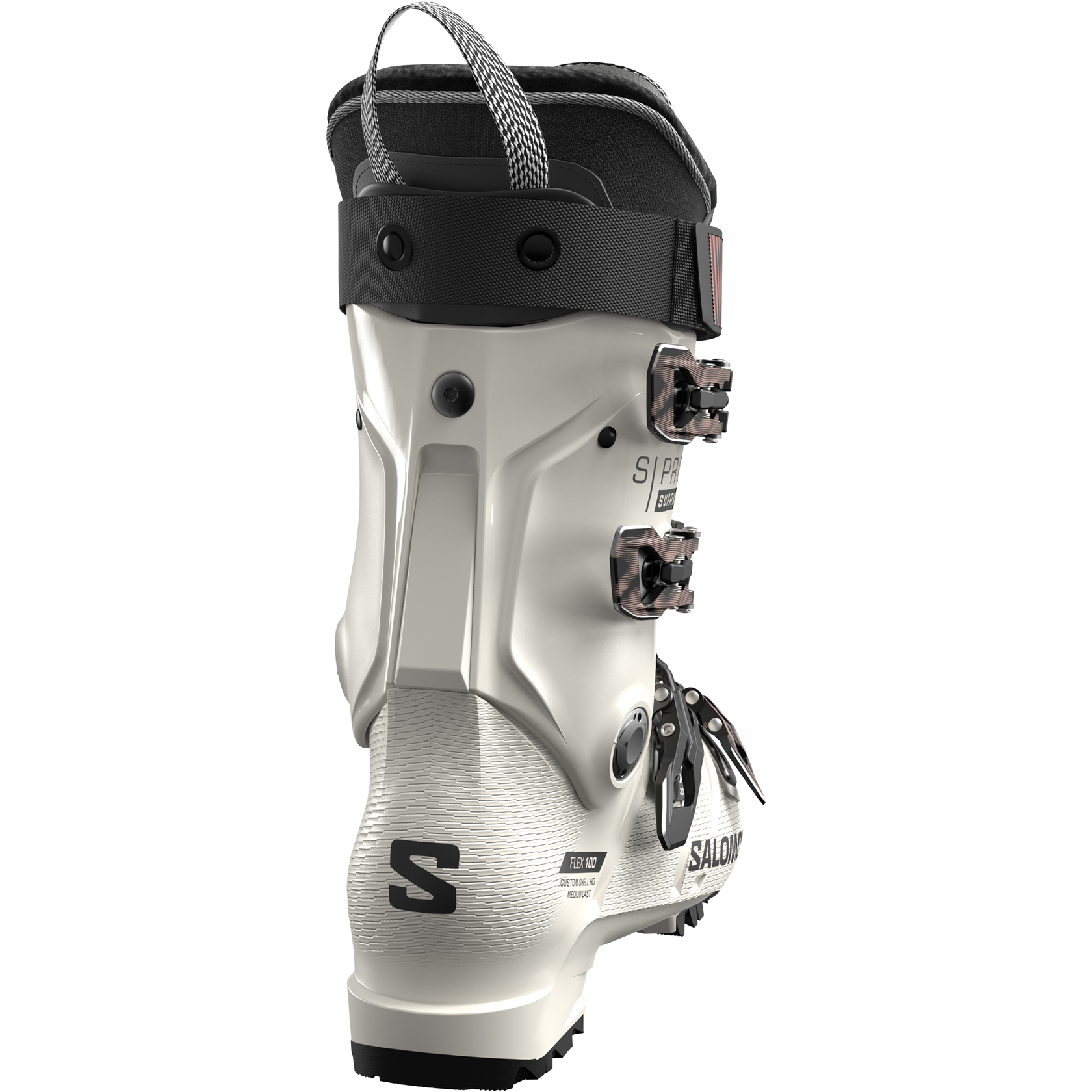 Salomon's S/PRO SUPRA 100 boots are designed to improve women's comfort, facilitate step-in, and offer excellent foothold regardless of the shape of your feet. Combining a women's calf adjuster and Custom Fit 4D liner with latex foam makes it easy to match the boots' fit to your specific needs.