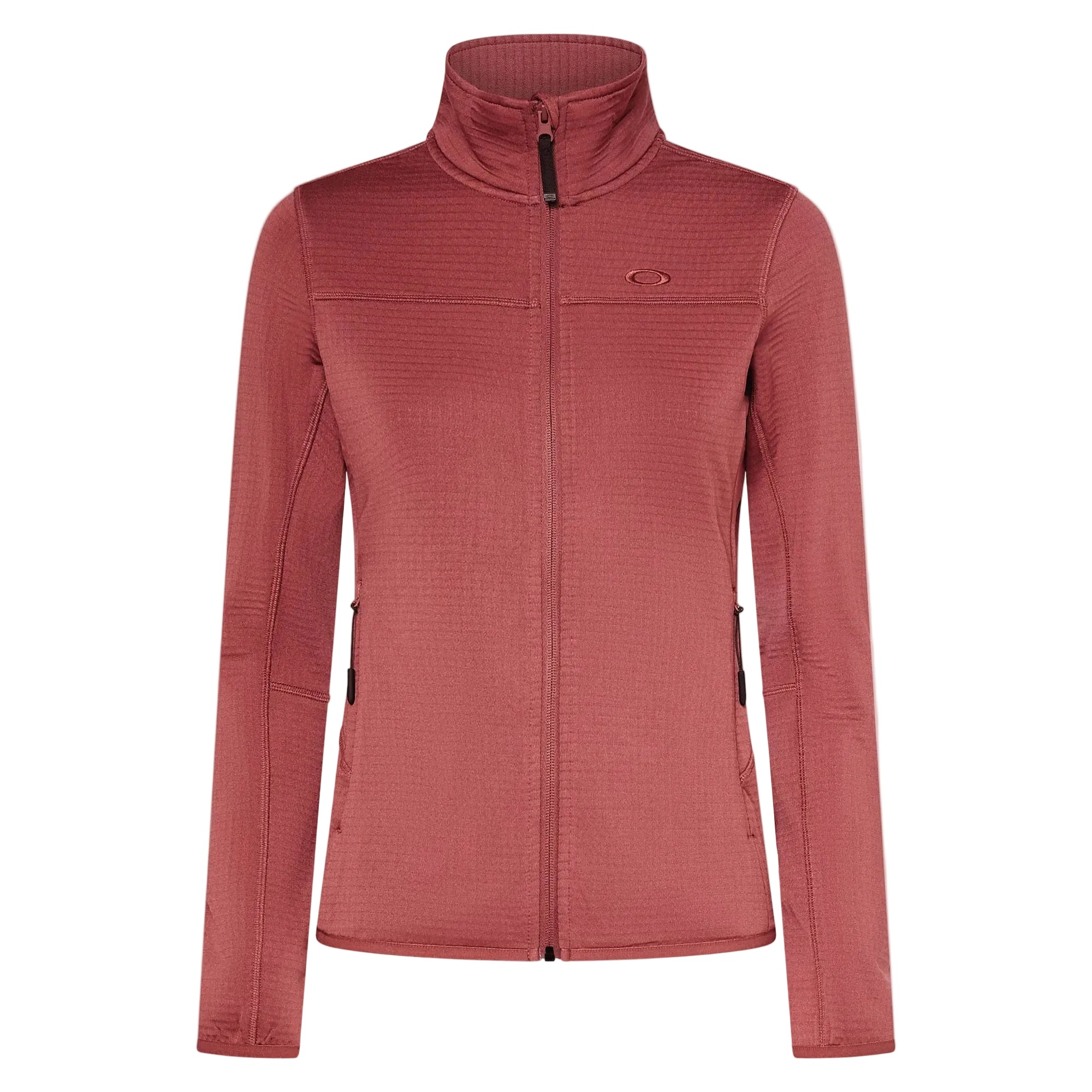Insulating women’s full-zip polyester grid sweatshirt, also ideal as a warming mid-layer in snowy conditions. Made from a blend of polyester and spandex, its slim silhouette and stretch binding at the hem and cuffs deliver bespoke comfort but also maximum flexibility of movement during your mountain activities. The mid-collar construction provides additional warmth around the neck and there are two zippered hand pockets for keeping your phone or valuables safe from harm. Decorated with embroidered Oakley logos.